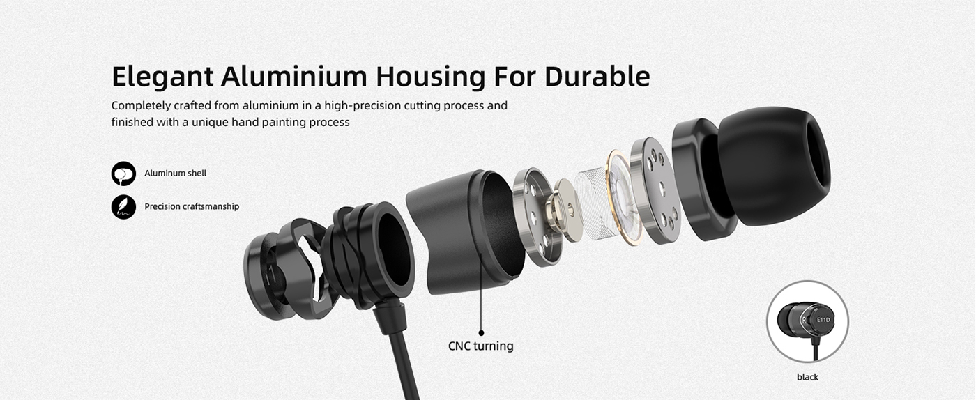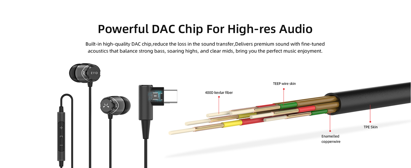 The high quality digital headphones comes with 10mm dynamic drivers and an aluminum capsule housing. The cable is silver plated copper wired and has an integrated three buttoned remote. The E11D uses a 96kHz/24bit digital-analogue converter in its USB Type-C connector head.