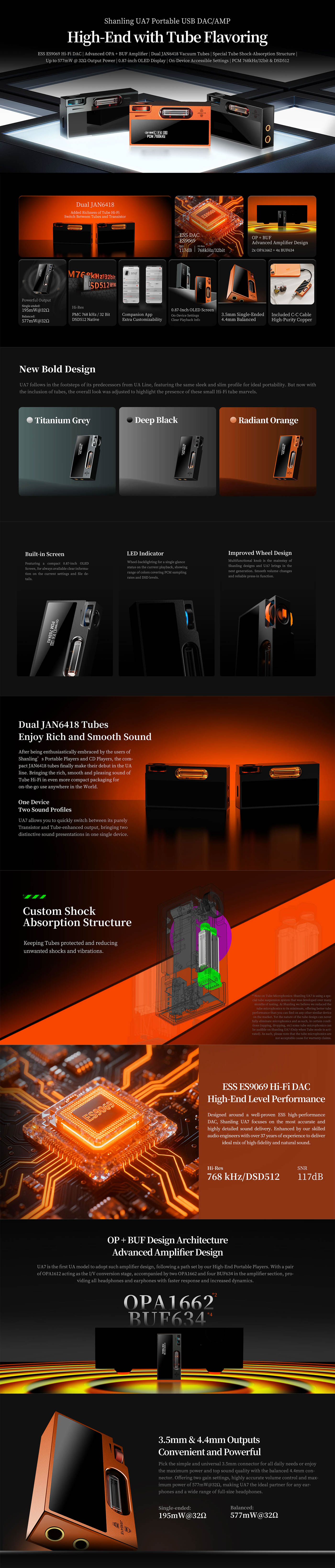 The Shanling UA7 is a high-performance portable DAC/AMP that blends cutting-edge digital fidelity with the warmth of analog sound. At its core lies the ESS ES9069 DAC, capable of decoding PCM up to 768kHz/32bit and native DSD512, ensuring pristine audio resolution. What sets the UA7 apart is its clearly visible dual JAN6418 vacuum tubes, delivering a rich, tube-flavored sound signature with the option to switch to a solid-state output for a cleaner, more neutral profile. Combined with an OP+BUF amplifier architecture, The UA7 delivers up to 577mW of output at 32Ω, providing ample power to confidently drive even high-impedance or power-hungry headphones.
