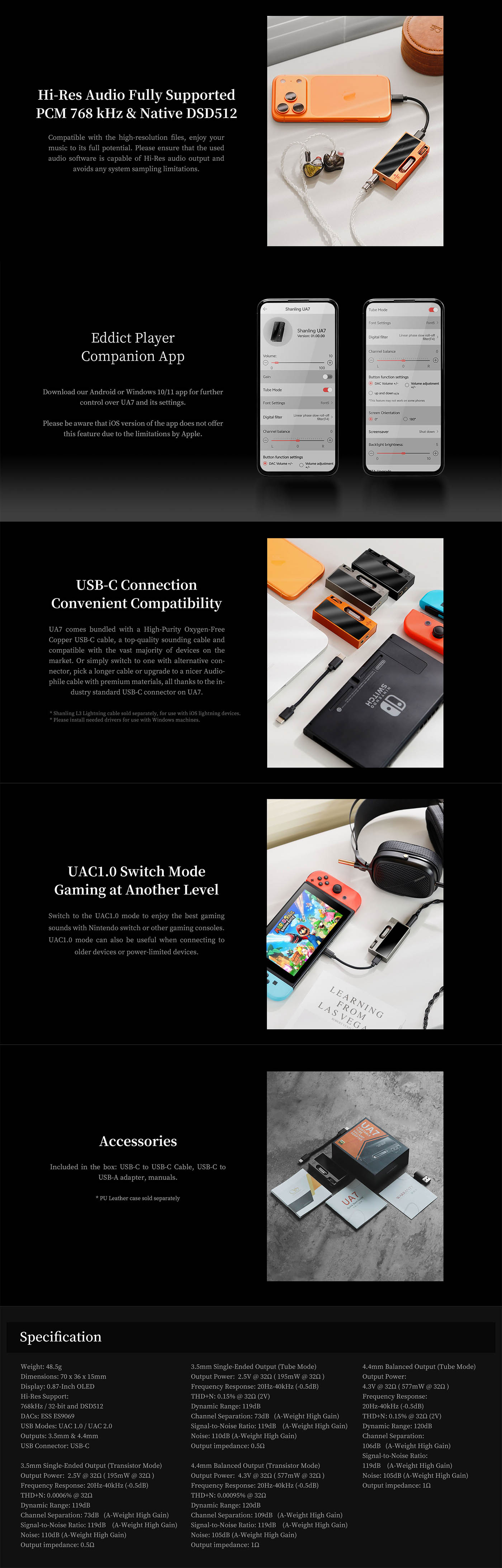 Crafted in a compact aluminum chassis, the UA7 is both sleek and robust, weighing just 48.5g. A 0.87-inch OLED screen provides real-time playback info, while a tactile multifunction wheel offers intuitive control. It features both 3.5mm single-ended and 4.4mm balanced outputs, making it compatible with a wide range of gear. USB-C connectivity ensures plug-and-play use with Android, Windows, and macOS devices, and the companion Eddict Player app allows for deeper customization (Android/Windows only).