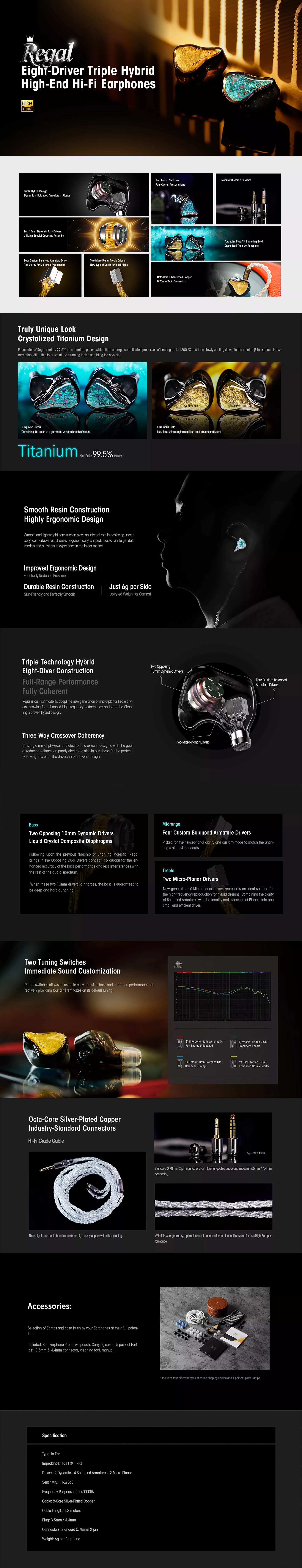 The Regal (ME800S) by Shanling is the manufacturers premium category hybrid, or tribrid earphone, which combines no less than eight drivers to provide the best listening experience possible. Two 10mm (Opposite Assembly) Dynamic Bass Drivers work to reduce distortion and to provide a deep, powerful bass. Four Custom Balanced Armature Drivers provide a great clarity of detail for mid-range, while two Miniature Planar Drivers ensure fast and precise high-frequencies.