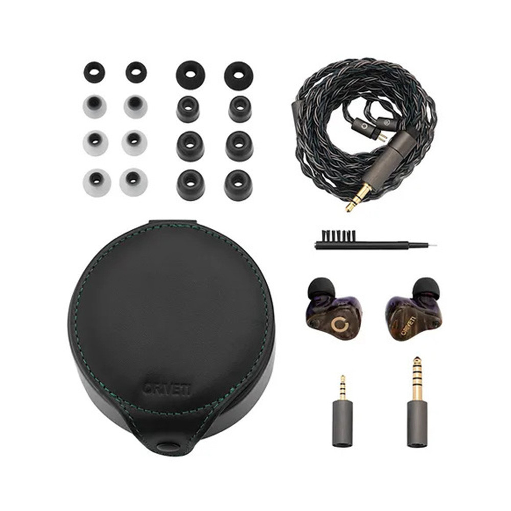 The Oriveti OH700VB is an ear monitor with 6+1 drivers (2 BA high, 4 BA mid, 1 dynamic low), featuring a replaceable cable, which combines the strengths of BA and dynamic drivers to deliver a more balanced, detailed sound. As a hybrid flagship, the unique features of the OH700VB include a mini switch on the front panel that allows switching between two sound settings, offering flexible choice for preferred sound, as well as a stainless steel vent on the housing for perfect airflow. The package includes a replaceable cable with 3.5mm, 2.5mm, 4.5mm connectors, a genuine leather hard case, a filter cleaning tool, and various ear tips.