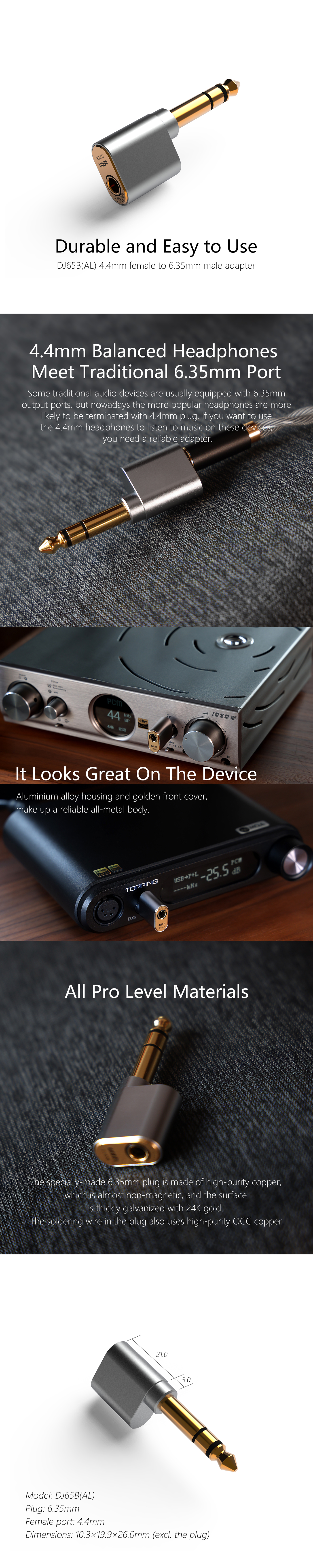 The DJ65B (AL) adapter enables the use of headphones or earphones with a 4.4mm Pentaconn connector on digital audio players (DAP), digital-to-analog converters (DAC), or amplifiers (AMP) equipped with a 6.35mm Jack input. It features 24-carat gold-plated, high-purity copper connectors, OCC internal wiring within a silver-colored aluminum housing. The AL version represents an appearance to match the manufacturer's new adapters and cables.